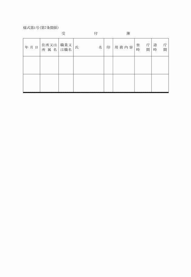 第7条 出入口閉鎖後に庁舎に入ろうとする者は、様式第1号による受付簿に所要事項を記載して庁舎管理者の許可を受けなければならない。